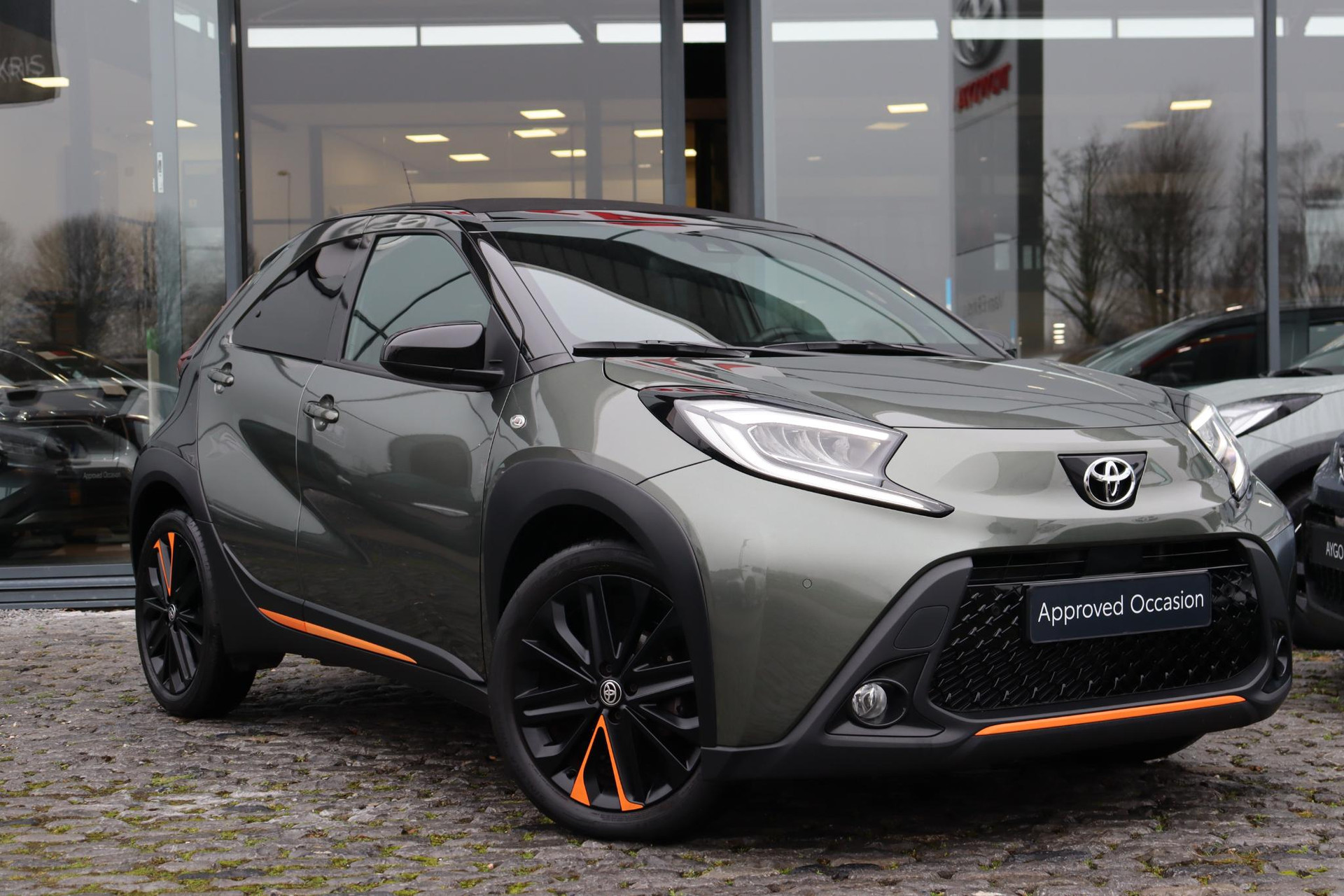 Complete Aygo-X Limited automaat in de kleur Cardamon Green met zwart dak en achterzijde. Deze Aygo X is compleet uitgerust met Canvas schuifdak, JBL audio, parkeersensoren voor en achter, stoelverwarming, draadloze telefoonlader, privacy glass achter, smart key entry, android auto, apple carplay en nog veel meer!