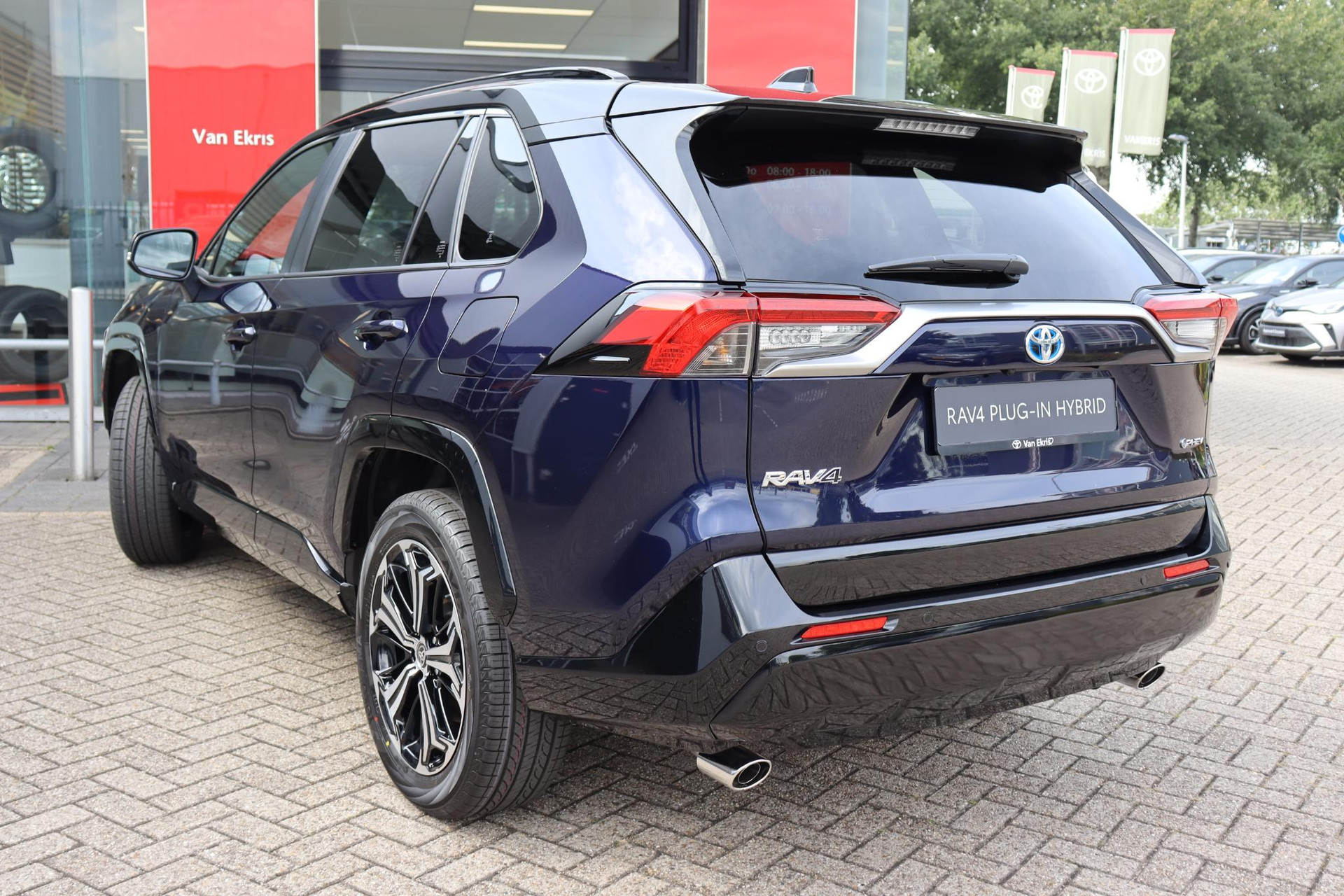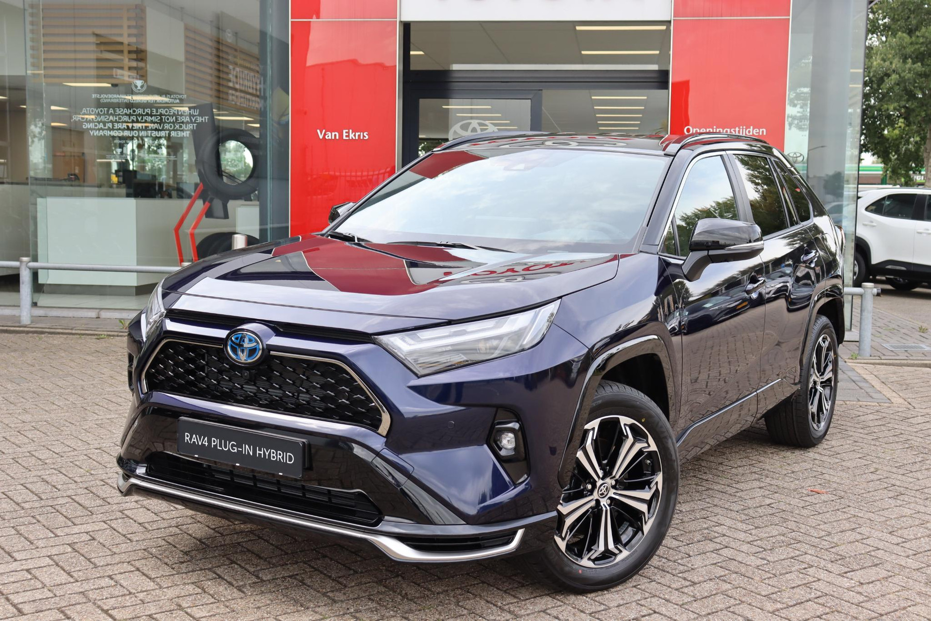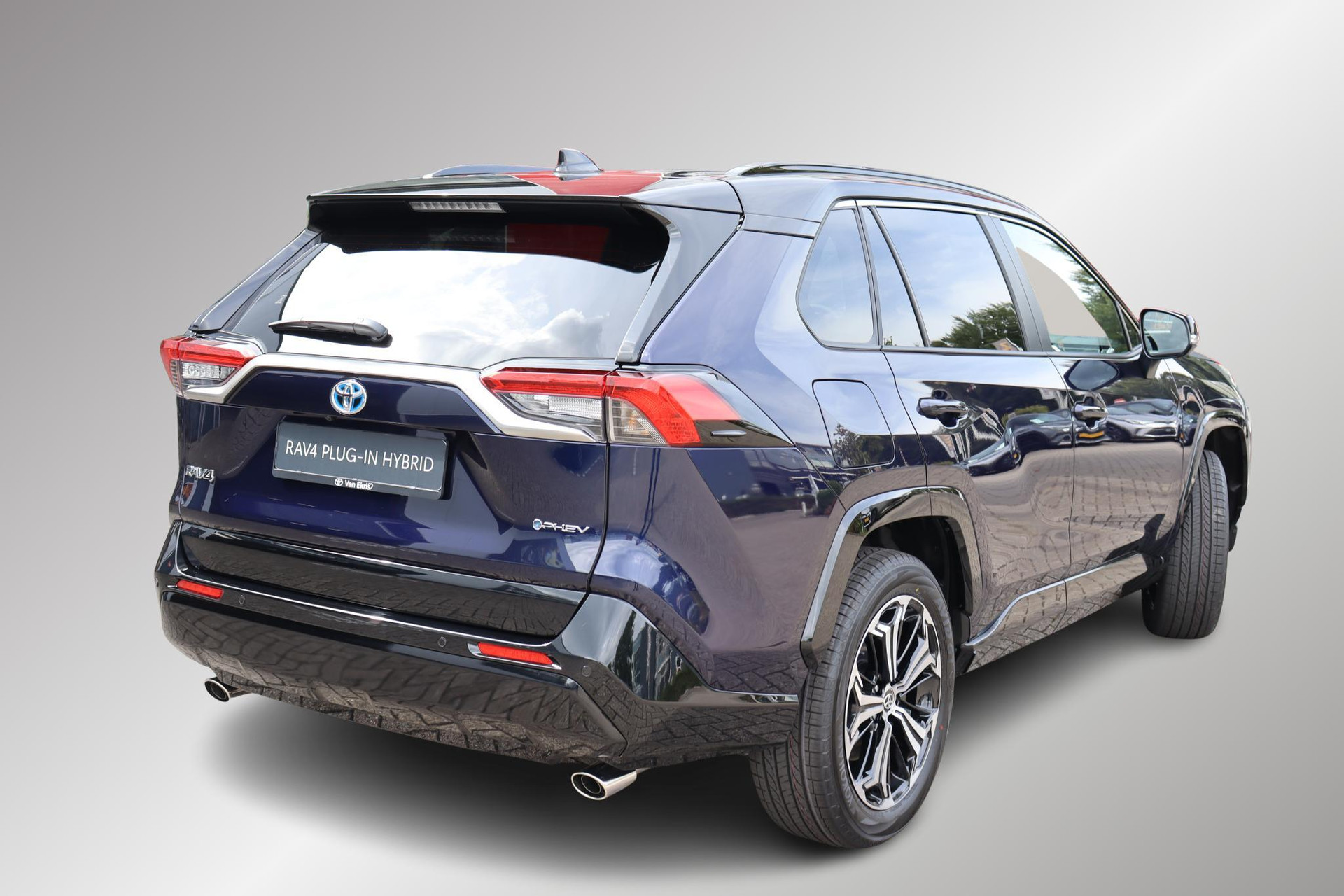 RAV4 AWD Plug-In Bi-Tone Plus in de kleur Midnight Blue metallic met zwarte bovenzijde. voorzien van veel luxe optie's zoals parkeersensoren voor en achter met automatische remfunctie, Blind spot monitor, Head up display, JBL audio met subwoofer, 360 graden camera, draadloze telefoonlader, achteruitrij assistent, Camera in binnenspiegel, zwart leder, stoelventilatie en meer!